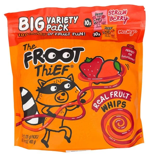 Strawberry Froot Thief Ingredients: Apples, Apple Juice, Strawberries, Black Carrot Extract, Natural Strawberry Flavor, Citrus Fiber, Plant Fiber Mango Froot Thief Ingredients: Apples, Apple Juice, Mangos, Citrus Fiber, Natural Mango Flavor, Plant Fiber